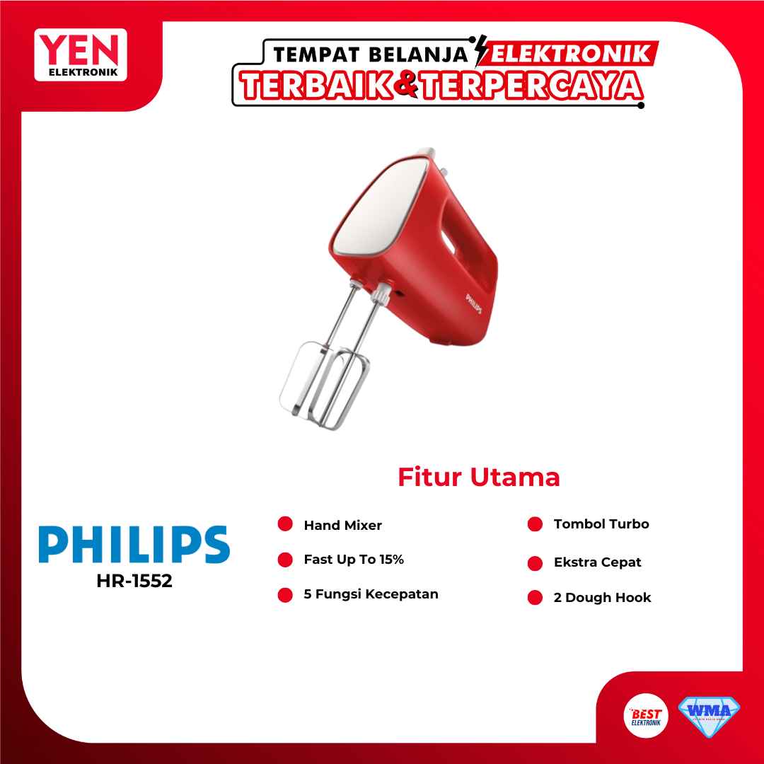 Philips HR1552 Hand Mixer adalah solusi ideal untuk kebutuhan baking dan memasak Anda sehari-hari. Dengan teknologi canggih dan desain user-friendly, hand mixer ini membuat proses pencampuran dan pengocokan adonan menjadi lebih mudah dan efisien.